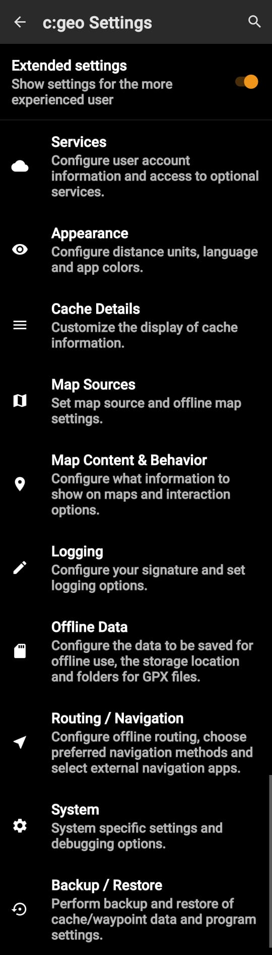 | Route berekenen | Met deze instelling kun je de maximale afstand selecteren tot hoe ver een route wordt berekend en op de kaart weergegeven tussen jouw positie en de geselecteerde cache. (standaard: 10 km) |
