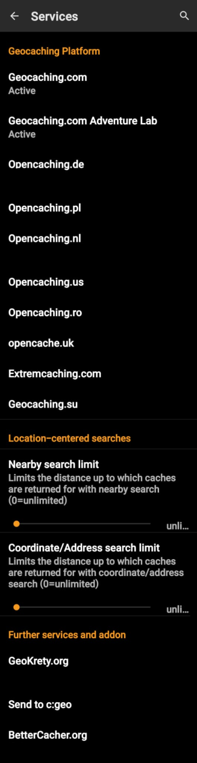 In het eerste gedeelte van de service-instellingen kun je de verbinding met de verschillende ondersteunde geocachingplatforms configureren. Momenteel ondersteunt c:geo de volgende geocaching-services: